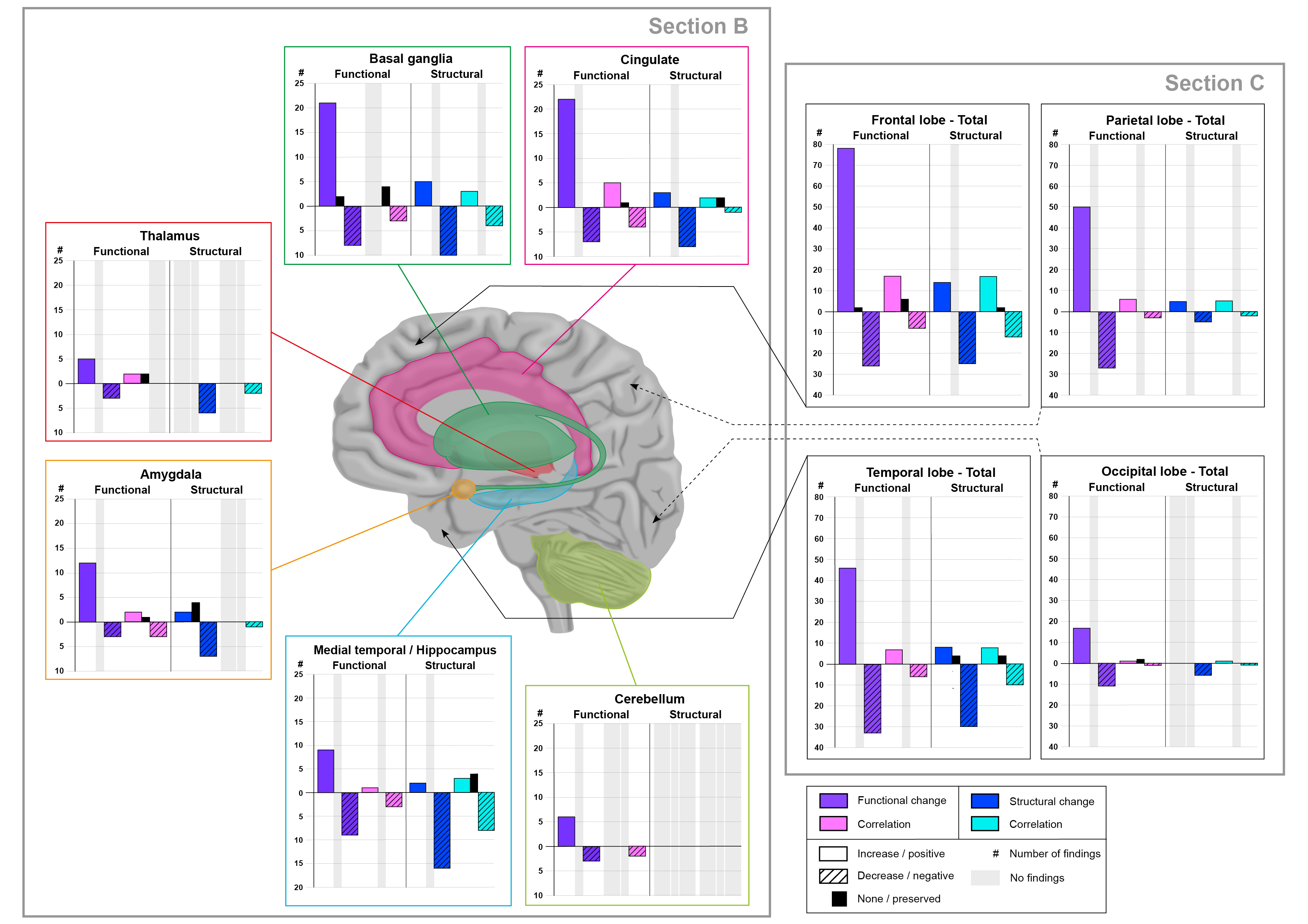 Gill worked with a neuroscientist at King’s College London to create figures for use in a neuroscience review paper. Two anatomical illustrations, one of a whole brain and the other of a sagittal section, were used to highlight areas of the human brain. They were then combined with illustrations of bar charts (also drawn by Gill), text and annotation to create two conceptual figures. An additional data figure was created, combining several bar charts. As well as supplying the complete figures, Gill also provided the neuroscientist with the individual illustrations of the anatomical brains and of each of the bar charts., for future use in presentations, etc.