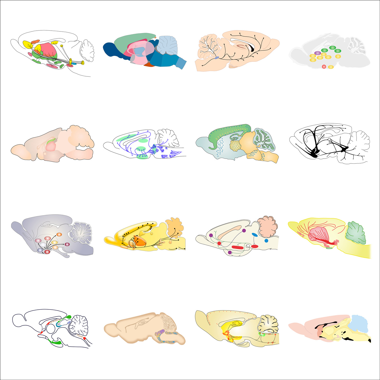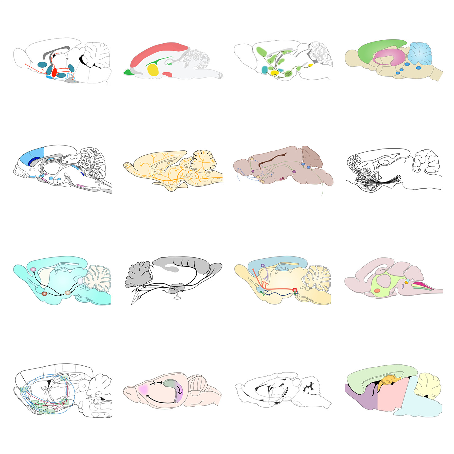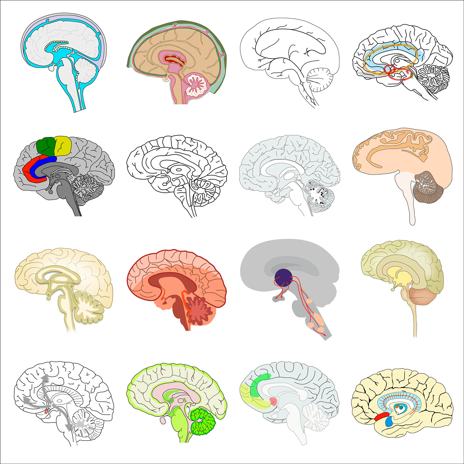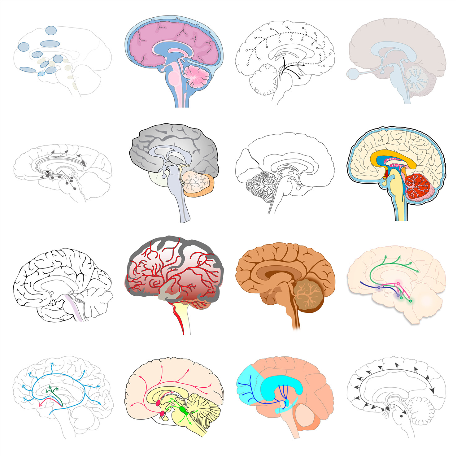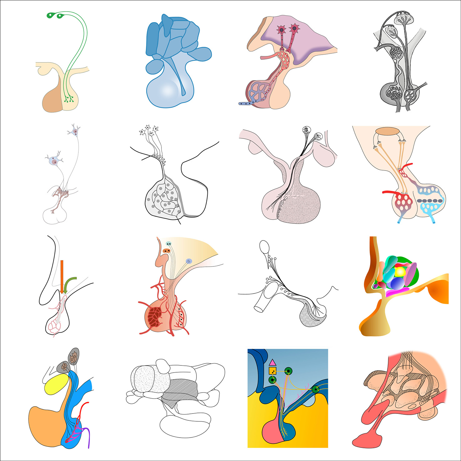As part of her graphic design PhD research, and particularly when collaborating with the Centre for Neuroimaging Sciences at King’s College London, Gill created typologies of scientific visual elements, all re-drawn from existing conceptual figures. These elements were also collected in a dedicated Instagram feed and are shown below in their typologised groups.