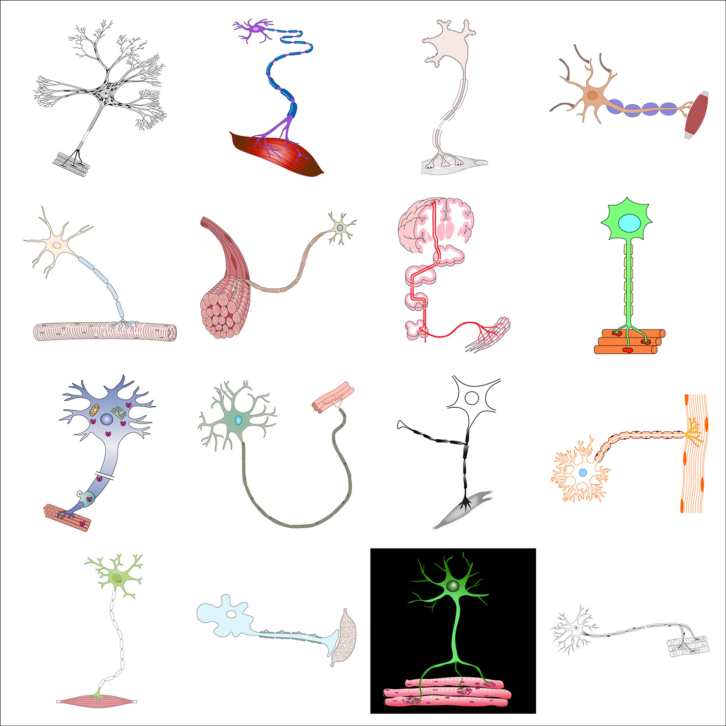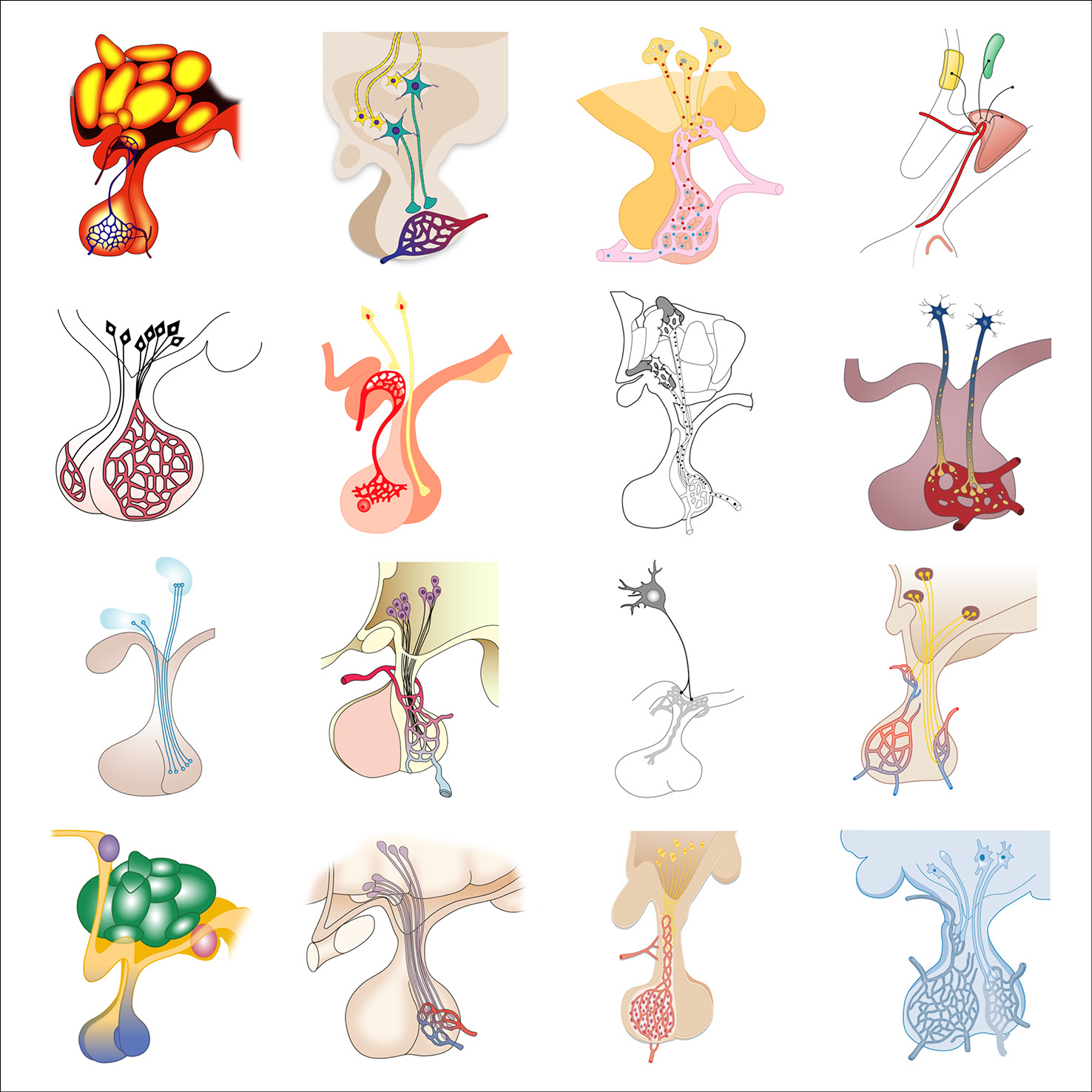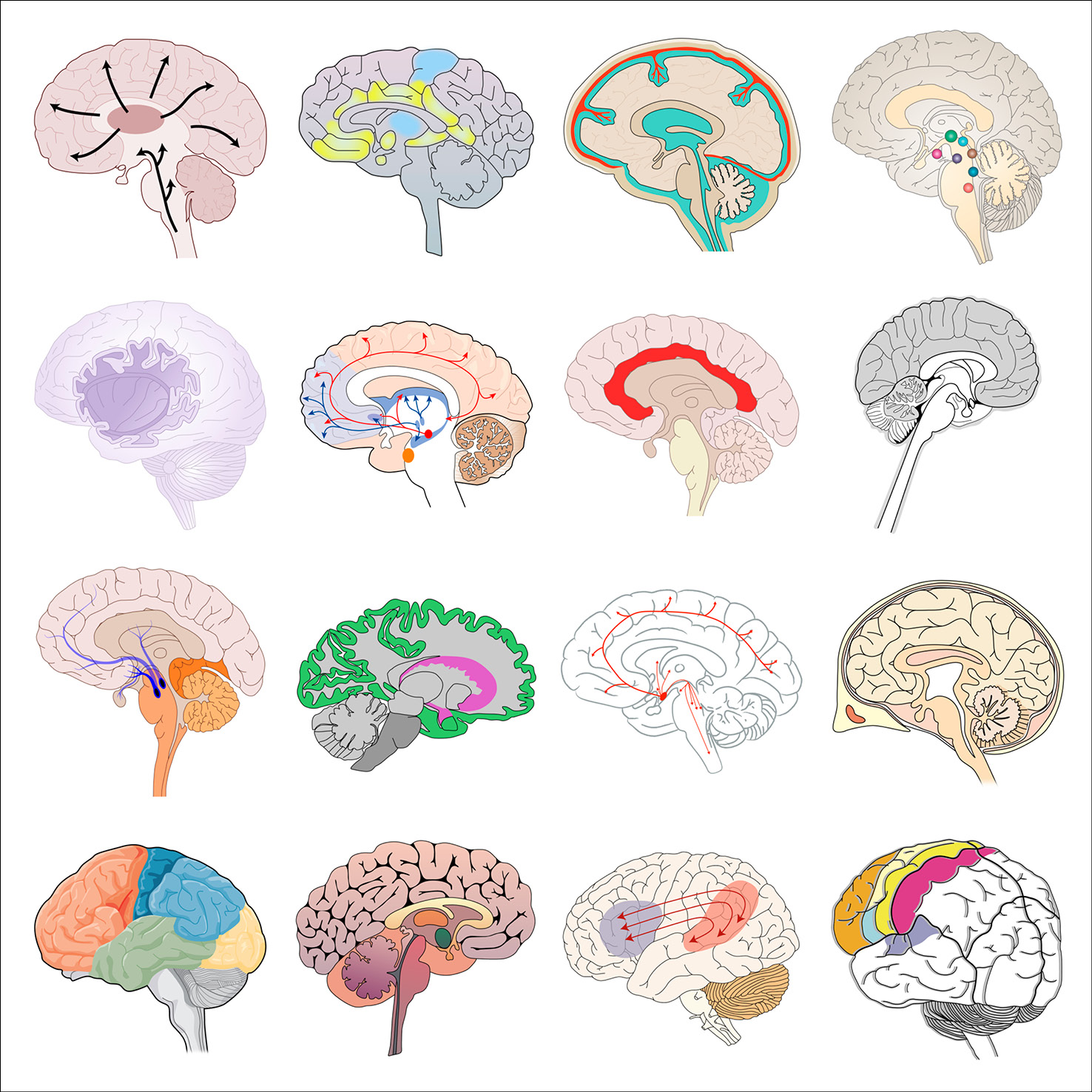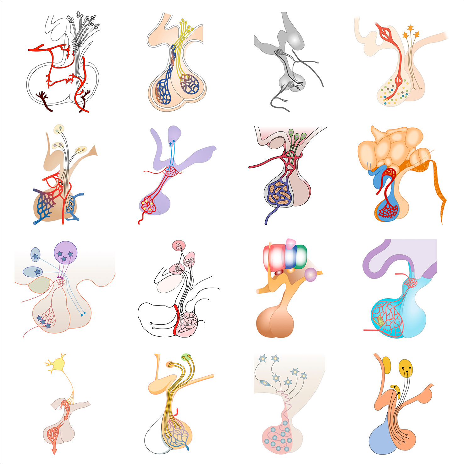 As part of her graphic design PhD research, and particularly when collaborating with the Centre for Neuroimaging Sciences at King’s College London, Gill created typologies of scientific visual elements, all re-drawn from existing conceptual figures. These elements were also collected in a dedicated Instagram feed and are shown below in their typologised groups.